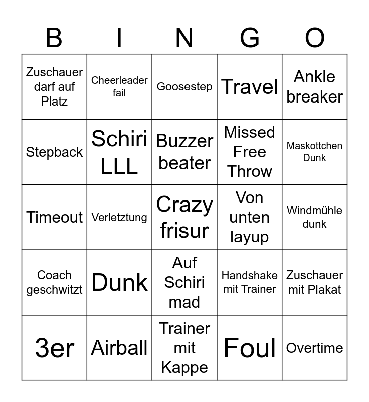 This bingo card has a free space and 24 words: 3er, Dunk, Buzzer beater, Foul, Ankle breaker, Zuschauer darf auf Platz, Cheerleader fail, Goosestep, Von unten layup, Windmühle dunk, Timeout, Schiri LLL, Handshake mit Trainer, Zuschauer mit Plakat, Stepback, Airball, Trainer mit Kappe, Travel, Maskottchen Dunk, Coach geschwitzt, Verletztung, Auf Schiri mad, Missed Free Throw and Overtime.