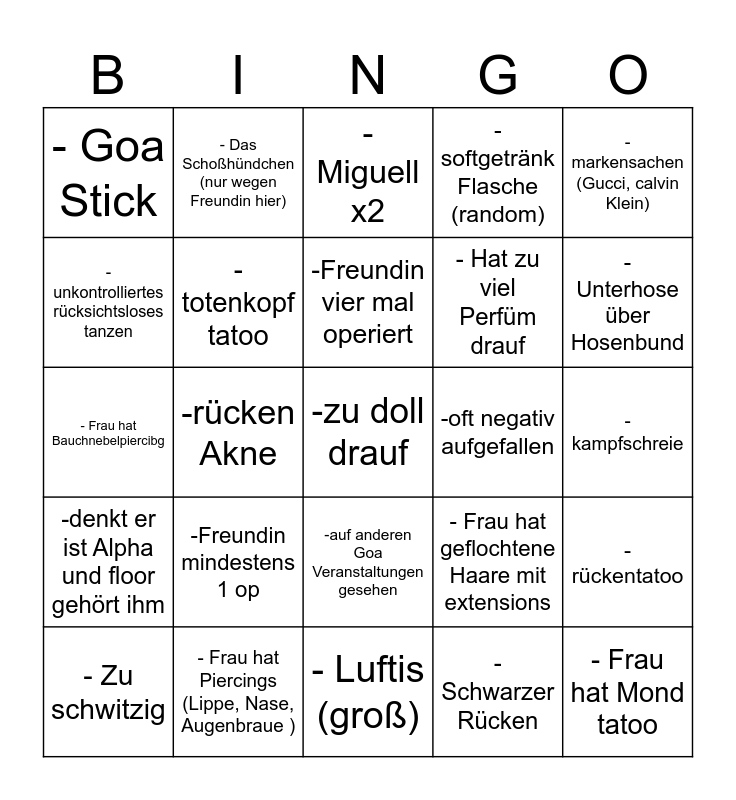 This bingo card has 37 words: Free!, goa tatoo, -alpha tier tatoo, -totenkopf tatoo, -rückentatoo, -Freundin mindestens 1 op, -Freundin vier mal operiert, -Tanga sichtbar, -markensachen (Gucci, calvin Klein), -ungesunde Bräune, -rücken Akne, -softgetränk Flasche (random), -zu doll drauf, -kampfschreie, -unkontrolliertes rücksichtsloses tanzen, -denkt er ist Alpha und floor gehört ihm, -siegerpose, -Miguell x2, -auf anderen Goa Veranstaltungen gesehen, -oft negativ aufgefallen, - Goa Stick, - Unterhose über Hosenbund, - Zu schwitzig, - Luftis (groß), - Gesichtslotion, - Schwarzer Rücken, - Das Schoßhündchen (nur wegen Freundin hier), - Steht im Weg, - Steht lange im Weg, - Steht unnötig im Weg, - Frau hat geflochtene Haare, - Frau hat Piercings (Lippe, Nase, Augenbraue ), - Frau hat Bauchnebelpiercibg, - Frau hat Mond tatoo, - Frau hat geflochtene Haare mit extensions, - Hat zu viel Perfüm drauf and -.