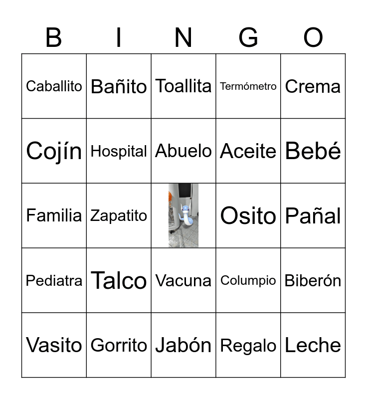 This bingo card has a free space and 24 words: Talco, Gorrito, Abuelo, Vasito, Crema, Caballito, Cojín, Bañito, Osito, Vacuna, Aceite, Familia, Columpio, Biberón, Hospital, Regalo, Pañal, Toallita, Bebé, Zapatito, Leche, Pediatra, Termómetro and Jabón.