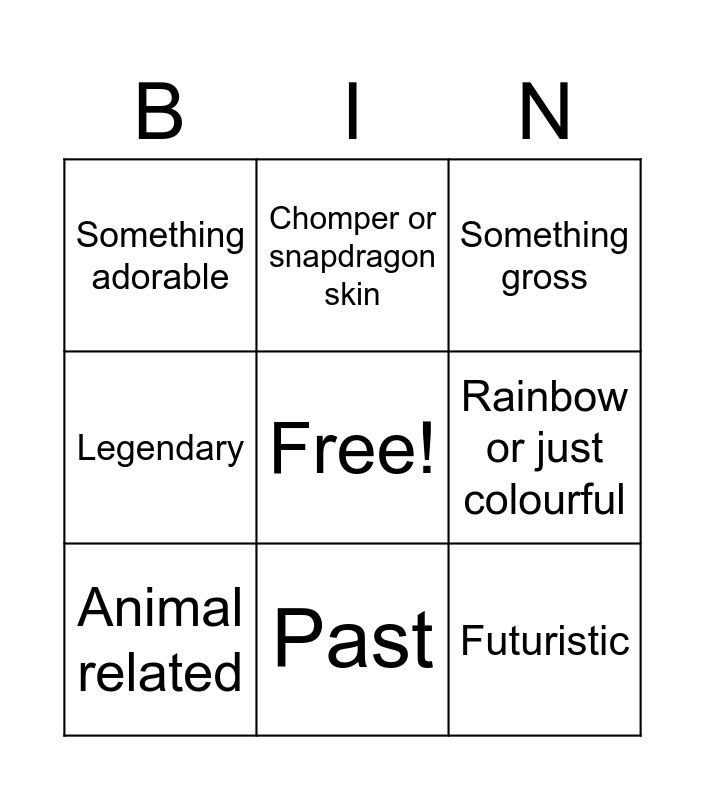 This bingo card has a free space and 8 words: Legendary, Chomper or snapdragon skin, Rainbow or just colourful, Animal related, Something gross, Something adorable, Past and Futuristic.