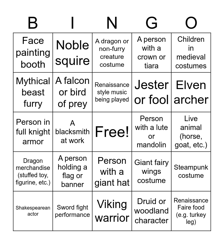 This bingo card has a free space and 41 words: Someone performing tricks, Person in full knight armor, Turkey leg being eaten, A falcon or bird of prey, Sword fight performance, Person with a giant hat, Renaissance style music being played, Someone holding a scroll, Children in medieval costumes, Dragon merchandise (stuffed toy, figurine, etc.), A blacksmith at work, A person with a crown or tiara, Renaissance Faire food (e.g. turkey leg), Live animal (horse, goat, etc.), Person with a lute or mandolin, A person holding a flag or banner, A giant faux beard, Face painting booth, King/Queen in costume, A dragon or non-furry creature costume, Steampunk costume, Femme pirate, Viking warrior, Jester or fool, Gothic witch, Blacksmith or tradesperson, Druid or woodland character, Witch or warlock with a staff, Elven archer, Medieval monk or nun, Cursed or undead character, Noble squire, Shakespearean actor, Pirate with a pet parrot, Giant fairy wings costume, Mythical beast furry, Assassin or rogue, Royal herald or town crier, Play a game, Buy a trinket and Sip from a flask.