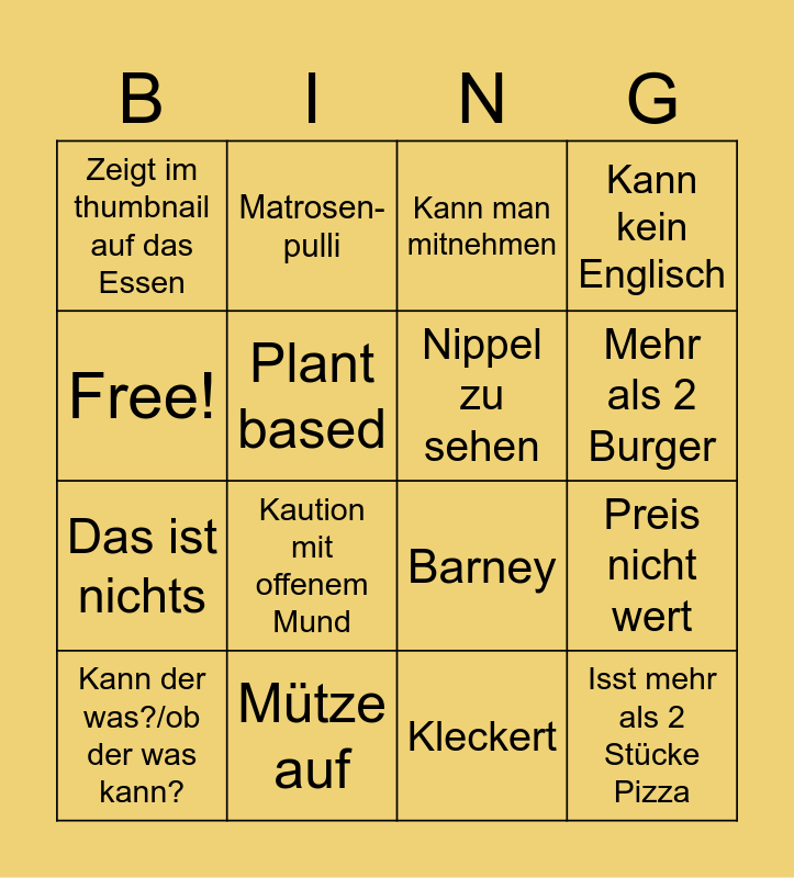 This bingo card has 16 words: Mütze auf, Preis nicht wert, Kann man mitnehmen, Zeigt im thumbnail auf das Essen, Das ist nichts, Matrosen-pulli, Barney, Kleckert, Free!, Plant based, Kann der was?/ob der was kann?, Kann kein Englisch, Kaution mit offenem Mund, Mehr als 2 Burger, Nippel zu sehen and Isst mehr als 2 Stücke Pizza.