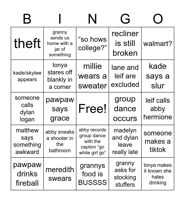 This bingo card has a free space and 24 words: abby sneaks a shooter in the bathroom, meredith swears, millie wears a sweater, pawpaw drinks fireball, walmart?, theft, kade/skylee appears, granny sends us home with a jar of something, group dance occurs, abby records group dance with the caption “go white girl go”, lane and leif are excluded, someone calls dylan logan, madelyn and dylan leave really late, someone makes a tiktok, tonya stares off blankly in a corner, granny asks for stocking stuffers, leif calls abby hermione, “so hows college?”, kade says a slur, pawpaw says grace, tonya makes it known she hates drinking, matthew says something awkward, recliner is still broken and grannys food is BUSSSS.