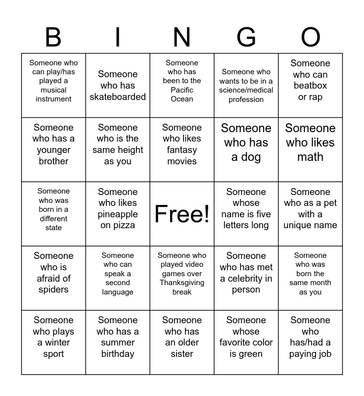 This bingo card has a free space and 24 words: Someone who can speak a second language, Someone who has a summer birthday, Someone who likes fantasy movies, Someone who plays a winter sport, Someone who can beatbox or rap, Someone who can play/has played a musical instrument, Someone who has a younger brother, Someone who has skateboarded, Someone whose name is five letters long, Someone who played video games over Thanksgiving break, Someone who has a dog, Someone who was born in a different state, Someone who has met a celebrity in person, Someone who was born the same month as you, Someone who is the same height as you, Someone whose favorite color is green, Someone who as a pet with a unique name, Someone who has been to the Pacific Ocean, Someone who likes math, Someone who likes pineapple on pizza, Someone who has/had a paying job, Someone who is afraid of spiders, Someone who wants to be in a science/medical profession and Someone who has an older sister.