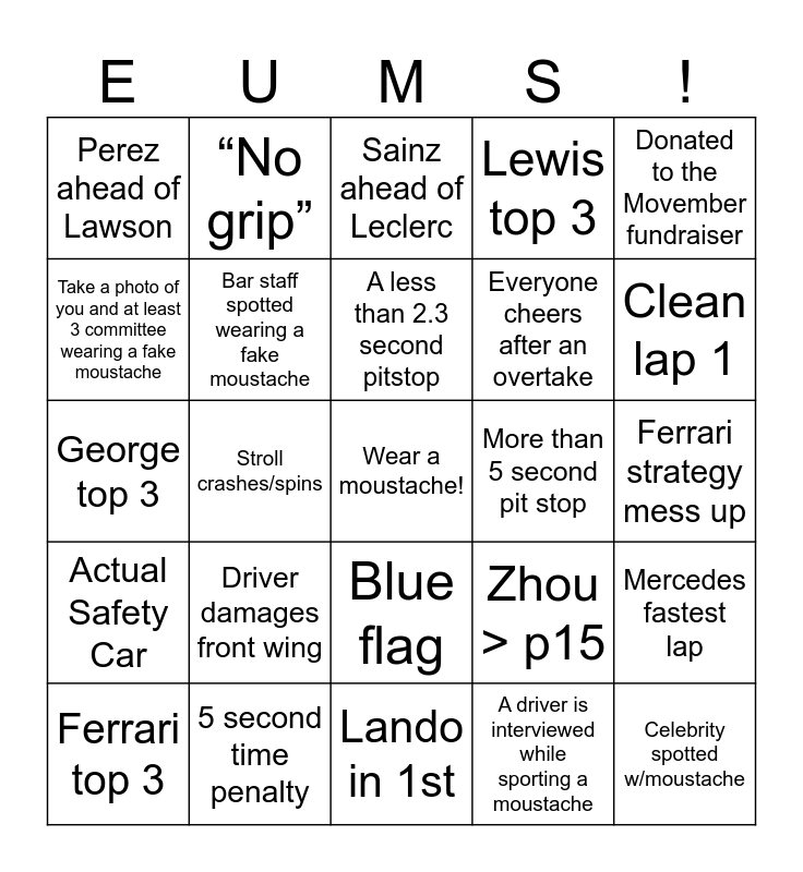 This bingo card has a free space and 49 words: Yellow flag, Celebrity spotted w/moustache, Max in 1st, Lando in 1st, Driver damages front wing, Max overtakes Lando, “No grip”, Lando overtakes Piastri, Take a photo of you and at least 3 committee wearing a fake moustache, Cadillac mention, Bar staff spotted wearing a fake moustache, Lewis top 3, Mercedes fastest lap, Zhou > p15, Redbull fastest lap, At least 1 DNF, A less than 2.3 second pitstop, More than 5 second pit stop, Max outside the points, Donated to the Movember fundraiser, Stroll crashes/spins, A driver is interviewed while sporting a moustache, Perez ahead of Lawson, Everyone cheers after an overtake, McLaren fastest lap, Clean lap 1, Ferrari top 3, Red flag, Blue flag, Actual Safety Car, VSC, “It’s lights out and away we go”, “Box Box”, 10 second time penalty, 5 second time penalty, Someone cheers for a team not in the top 3, Someone cheers for a driver not in the top 10, “Tire degradation”, Ferrari strategy mess up, Driver locks up, Team principal looks stressed, Lap 1 crash, “Plan B” (or C/D), “The undercut” OR “the overcut”, George top 3, Sainz ahead of Leclerc, Colapinto in the points, Driver pushed wide and 1st 10+ seconds ahead.