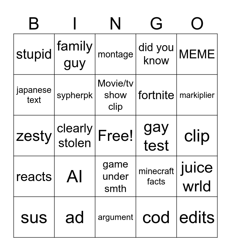 This bingo card has a free space and 24 words: AI, ad, Movie/tv show clip, sus, MEME, stupid, japanese text, family guy, gay test, game under smth, fortnite, zesty, minecraft facts, juice wrld, sypherpk, cod, clip, montage, markiplier, clearly stolen, edits, reacts, did you know and argument.