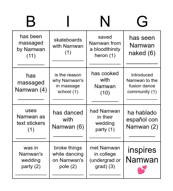 This bingo card has 16 words: was in Namwan's wedding party (2) ___________, broke things while dancing on Namwan's pole (2) ___________, saved Namwan from a bloodthirsty heron (1) ___________, has seen Namwan naked (6) _________, has massaged Namwan (4) ________, skateboards with Namwan (1) ___________, had Namwan in their wedding party (1) ___________, ha hablado español con Namwan (2) ________, has been massaged by Namwan (11) _________, is the reason why Namwan's in massage school (1) ____________, met Namwan in college (undergrad or grad) (3) ___________, introduced Namwan to the fusion dance community (1) ____________, uses Namwan as text stickers (1) __________, has danced with Namwan (6) _________, has cooked with Namwan (10) _________ and inspires Namwan 💕.