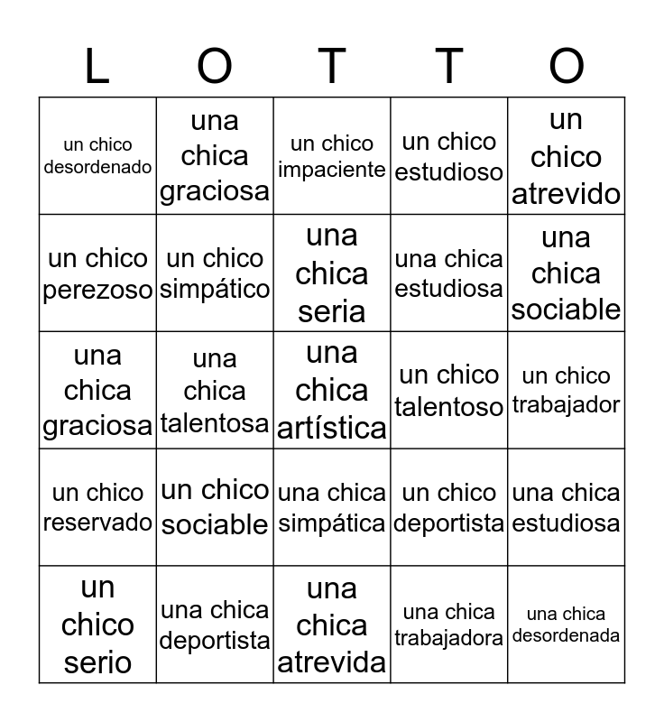 This bingo card has 25 words: un chico sociable, una chica atrevida, una chica seria, un chico serio, un chico atrevido, un chico desordenado, un chico perezoso, una chica graciosa, un chico talentoso, una chica simpática, una chica estudiosa, una chica graciosa, un chico deportista, una chica estudiosa, un chico simpático, una chica desordenada, un chico trabajador, un chico impaciente, una chica sociable, una chica talentosa, una chica artística, una chica deportista, un chico reservado, un chico estudioso and una chica trabajadora.