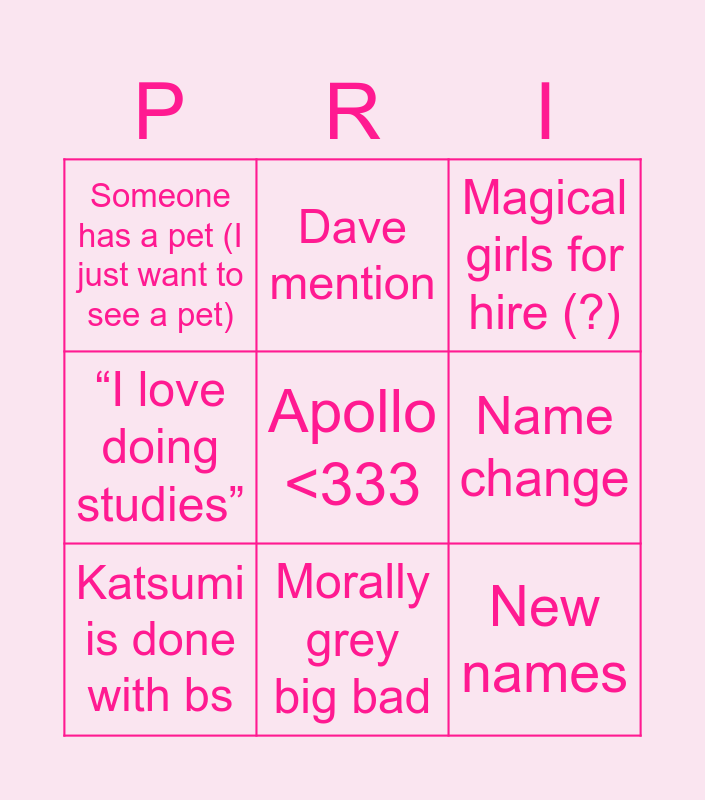 This bingo card has a free space and 10 words: Morally grey big bad, Magical girls for hire (?), Someone has a pet (I just want to see a pet), New names, “I love doing studies”, Katsumi is done with bs, Dave mention, Art theme (cause of the overalls), Name change and “I love doing studies”.