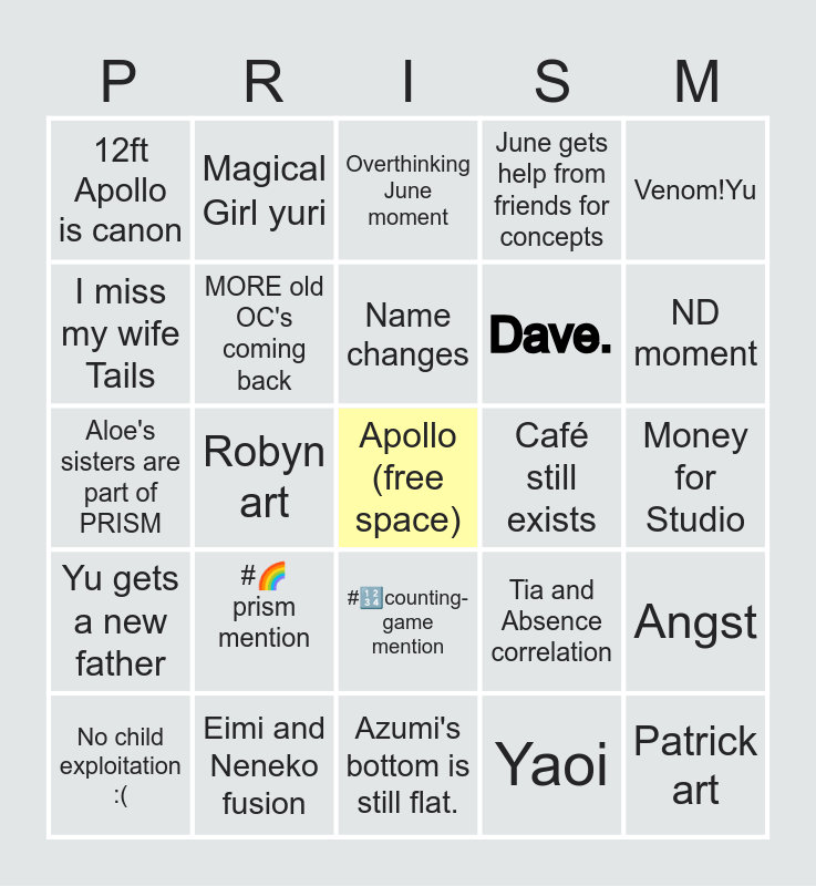 This bingo card has a free space and 24 words: #🌈prism mention, Eimi and Neneko fusion, Name changes, No child exploitation :(, Venom!Yu, 12ft Apollo is canon, I miss my wife Tails, Magical Girl yuri, Café still exists, #🔢counting-game mention, Dave., Aloe's sisters are part of PRISM, Tia and Absence correlation, Angst, MORE old OC's coming back, Yaoi, Money for Studio, Overthinking June moment, ND moment, Robyn art, Patrick art, Yu gets a new father, June gets help from friends for concepts and Azumi's bottom is still flat..