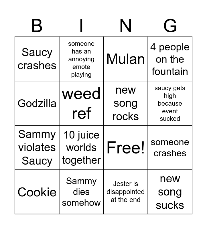 This bingo card has 20 words: someone crashes, Lego apears, Mulan, Sammy says something stupid, Cookie, Godzilla, Sammy dies somehow, Saucy crashes, Sammy violates Saucy, someone has an annoying emote playing, 10 juice worlds together, Free!, weed ref, new song sucks, new song rocks, Sammy asks what's going on, saucy gets high because event sucked, 4 people on the fountain, Jester is disappointed at the end and Sanae talks.