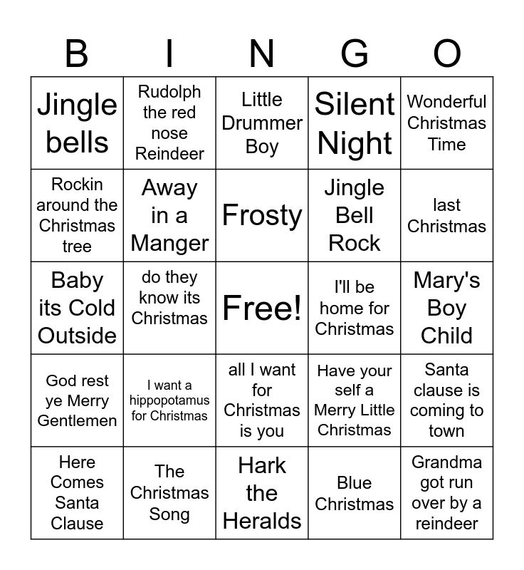 This bingo card has a free space and 24 words: I want a hippopotamus for Christmas, The Christmas Song, Frosty, Here Comes Santa Clause, Wonderful Christmas Time, Jingle bells, Rockin around the Christmas tree, Rudolph the red nose Reindeer, I'll be home for Christmas, all I want for Christmas is you, Jingle Bell Rock, Baby its Cold Outside, Have your self a Merry Little Christmas, Santa clause is coming to town, Away in a Manger, Blue Christmas, Mary's Boy Child, Little Drummer Boy, last Christmas, do they know its Christmas, Grandma got run over by a reindeer, God rest ye Merry Gentlemen, Silent Night and Hark the Heralds.