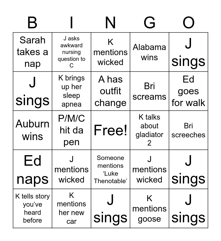 This bingo card has a free space and 24 words: J mentions wicked, K mentions her new car, A has outfit change, K tells story you’ve heard before, J sings, Sarah takes a nap, J sings, J asks awkward nursing question to C, K talks about gladiator 2, Someone mentions ‘Luke Thenotable’, Bri screams, Auburn wins, J mentions wicked, J sings, K brings up her sleep apnea, K mentions goose, Bri screeches, K mentions wicked, Ed goes for walk, P/M/C hit da pen, J sings, Ed naps, Alabama wins and J sings.