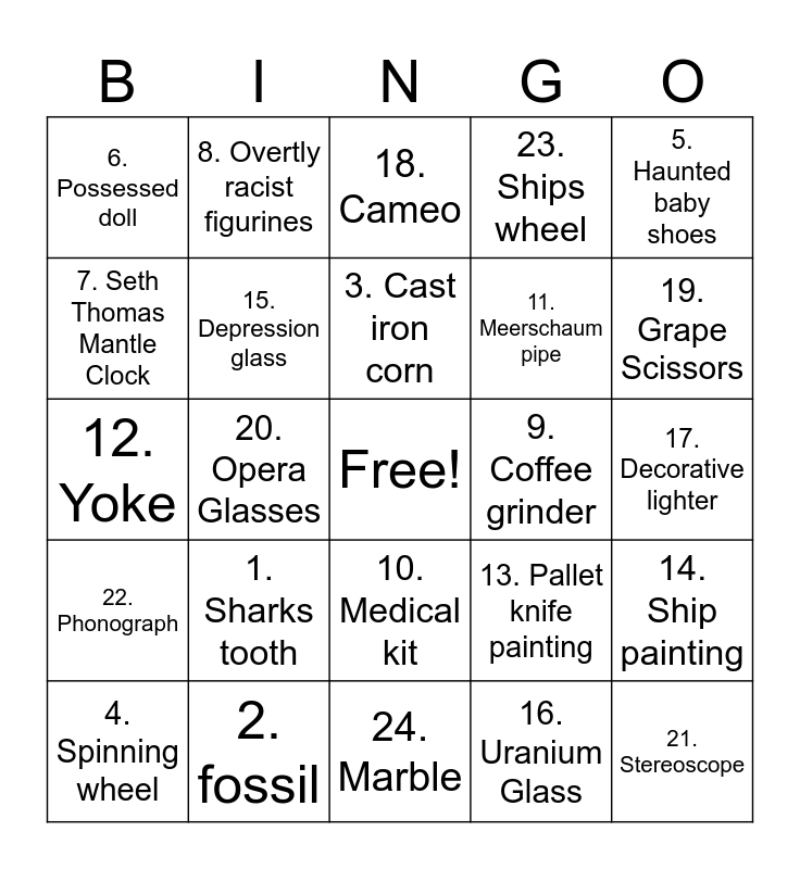 This bingo card has a free space and 24 words: 1. Sharks tooth, 2. fossil, 3. Cast iron corn, 4. Spinning wheel, 5. Haunted baby shoes, 6. Possessed doll, 7. Seth Thomas Mantle Clock, 8. Overtly racist figurines, 9. Coffee grinder, 10. Medical kit, 11. Meerschaum pipe, 12. Yoke, 13. Pallet knife painting, 14. Ship painting, 15. Depression glass, 16. Uranium Glass, 17. Decorative lighter, 18. Cameo, 19. Grape Scissors, 20. Opera Glasses, 21. Stereoscope, 22. Phonograph, 23. Ships wheel and 24. Marble.