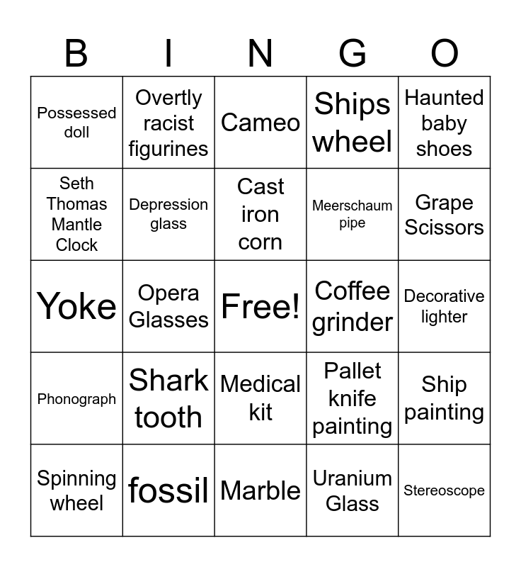This bingo card has a free space and 24 words: Shark tooth, fossil, Cast iron corn, Spinning wheel, Haunted baby shoes, Possessed doll, Seth Thomas Mantle Clock, Overtly racist figurines, Coffee grinder, Medical kit, Meerschaum pipe, Yoke, Pallet knife painting, Ship painting, Depression glass, Uranium Glass, Decorative lighter, Cameo, Grape Scissors, Opera Glasses, Stereoscope, Phonograph, Ships wheel and Marble.