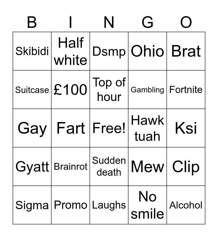 This bingo card has a free space and 24 words: Brainrot, Promo, Top of hour, Sigma, Brat, Skibidi, Suitcase, Half white, Hawk tuah, Sudden death, Gambling, Gay, Mew, Clip, £100, No smile, Ksi, Dsmp, Fortnite, Fart, Alcohol, Gyatt, Ohio and Laughs.