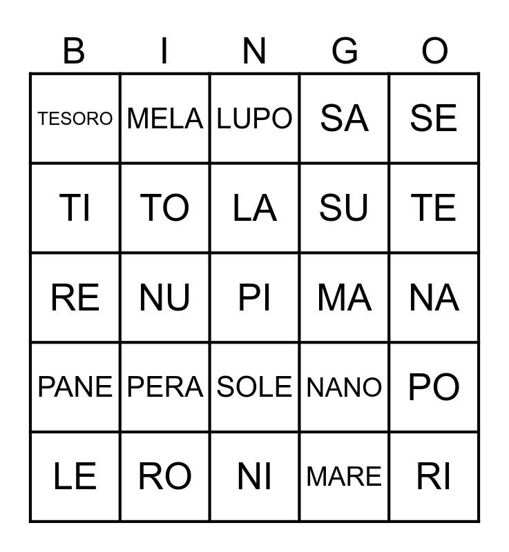 This bingo card has a free space and 24 words: PERA, RO, LA, LE, SE, TESORO, TI, MELA, MA, SOLE, SU, RE, NANO, PO, TO, MARE, NA, LUPO, TE, NU, RI, PANE, SA and NI.