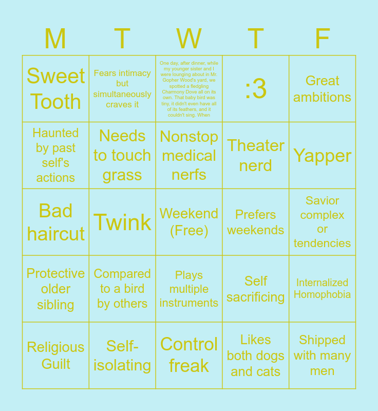 This bingo card has a free space and 24 words: Compared to a bird by others, Self-isolating, Nonstop medical nerfs, Religious Guilt, Great ambitions, Sweet Tooth, Haunted by past self's actions, Fears intimacy but simultaneously craves it, Prefers weekends, Plays multiple instruments, Theater nerd, Bad haircut, Self sacrificing, Internalized Homophobia, Needs to touch grass, Likes both dogs and cats, Savior complex or tendencies, One day, after dinner, while my younger sister and I were lounging about in Mr. Gopher Wood's yard, we spotted a fledgling Charmony Dove all on its own. That baby bird was tiny, it didn't even have all of its feathers, and it couldn't sing. When, Yapper, Twink, Shipped with many men, Protective older sibling, :3 and Control freak.