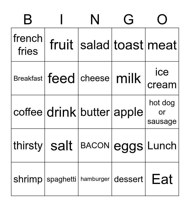 This bingo card has 33 words: Eat, food, drink, hungry, thirsty, feed, meat, shrimp, fruit, vegetables, cheese, salad, sandwich, water, apple, ice cream, spaghetti, coffee, salt, eggs, BACON, potato, french fries, hot dog or sausage, hamburger, butter, toast, milk, Breakfast, Lunch, Dinner, dessert and candy.