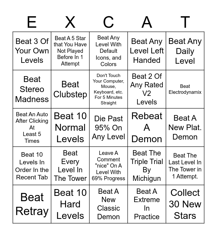 This bingo card has 30 words: Beat 10 Hard Levels, Beat 10 Harder Levels, Beat 10 Normal Levels, Beat The Challenge By The Vault Keeper, Beat 3 Of Your Own Levels, Beat Any Level With Default Icons, and Colors, Beat Clubstep, Leave A Comment "nice" On A Level With 69% Progress, Rebeat A Demon, Beat A New Classic Demon, Beat A New Plat. Demon, Die Past 95% On Any Level, Beat A Extreme In Practice, Collect 30 New Stars, Beat Electrodynamix, Beat A Level With Your Eye Closed The Entire Time, Beat The Triple Trial By Michigun, Beat 10 Levels In Order In the Recent Tab, Beat Every Level In The Tower, Beat Any Daily Level, Beat An Auto After Clicking At Least 5 Times, Collect 10 New User Coins, Beat A 5 Star that You Have Not Played Before In 1 Attempt, Beat 2 Of Any Rated V2 Levels, Beat Stereo Madness, Beat Any Level Left Handed, Beat The Last Level In The Tower in 1 Attempt., Beat Retray, Don't Touch Your Computer, Mouse, Keyboard, etc. For 5 Minutes Straight and Touch Grass IRL.