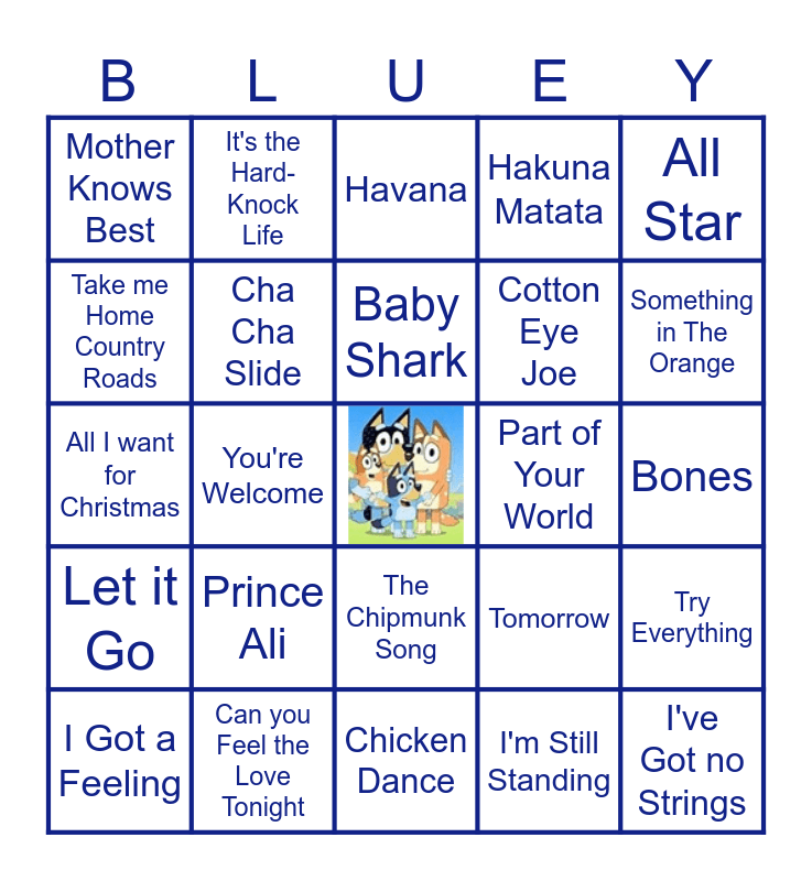 This bingo card has a free space and 52 words: Under the Sea, I've Got no Strings, Macarena, Chicken Dance, Prince Ali, The Hamster Dance, It's the Hard-Knock Life, Super califragilistic expialidocious, Take me Home Country Roads, Do You Want to Build a Snowman, Cha Cha Slide, Daddy, Try Everything, Tomorrow, Green Family Vacation, Meant to be, Baby Shark, Part of Your World, Raining Tacos, All Star, You're Welcome, I'm Still Standing, Mother Knows Best, Cotton Eye Joe, The Middle, Be our Guest, The Party Freeze Dance Song, Touch the Sky, Something in The Orange, You've got a Friend in Me, I like to Move it, Hakuna Matata, Bluey Theme, Hot Dog!, Peanut Butter Jelly Time, Havana, Can you Feel the Love Tonight, The Floor is Lava, A Bar Song (Tipsy), When will my life Begin?, Y.M.C.A., Bones, Let it Go, Life is a Highway, The Chipmunk Song, I want Hippopotamus for Christmas, Who Let the Dogs Out, All I want for Christmas, Fathers and Daughter, In Summer, I Got a Feeling and Life is An Open Door.