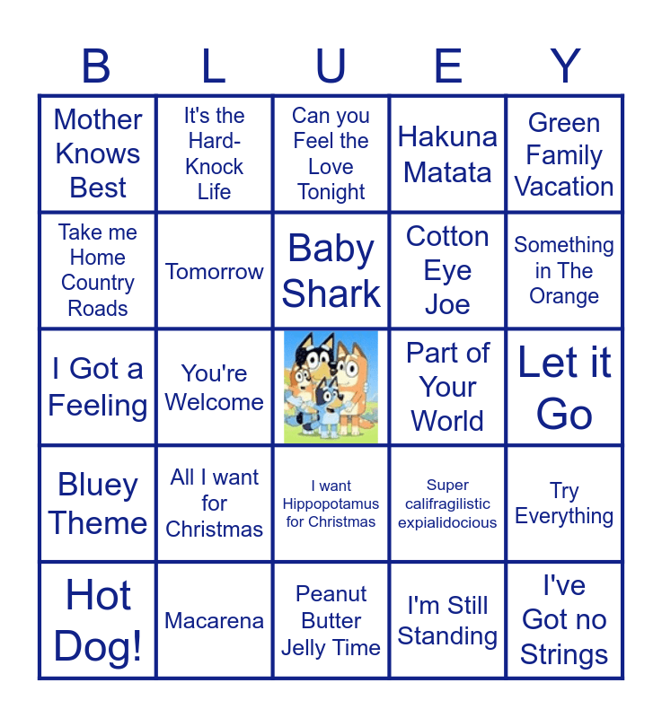 This bingo card has a free space and 52 words: Life is a Highway, I've Got no Strings, When will my life Begin?, Peanut Butter Jelly Time, All I want for Christmas, Fathers and Daughter, It's the Hard-Knock Life, The Floor is Lava, Take me Home Country Roads, All Star, Tomorrow, Chicken Dance, Try Everything, Super califragilistic expialidocious, Do You Want to Build a Snowman, Meant to be, Baby Shark, Part of Your World, Raining Tacos, Green Family Vacation, You're Welcome, I'm Still Standing, Mother Knows Best, Cotton Eye Joe, The Middle, Be our Guest, The Party Freeze Dance Song, Touch the Sky, Something in The Orange, Bones, I like to Move it, Hakuna Matata, A Bar Song (Tipsy), Daddy, Havana, Can you Feel the Love Tonight, Macarena, Y.M.C.A., Prince Ali, You've got a Friend in Me, Who Let the Dogs Out, Let it Go, Bluey Theme, The Chipmunk Song, I want Hippopotamus for Christmas, The Hamster Dance, Under the Sea, I Got a Feeling, Life is An Open Door, In Summer, Hot Dog! and Cha Cha Slide.