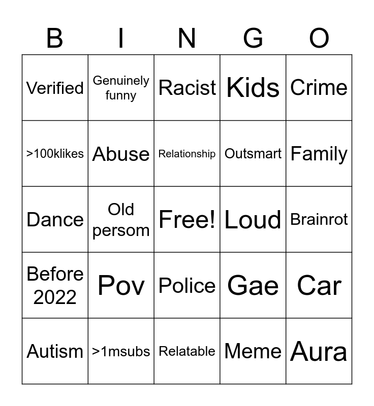 This bingo card has a free space and 24 words: Autism, Pov, Relationship, Meme, Crime, Verified, Genuinely funny, Racist, Loud, Brainrot, Dance, Abuse, Gae, Car, >100klikes, >1msubs, Relatable, Kids, Family, Before 2022, Old persom, Police, Outsmart and Aura.