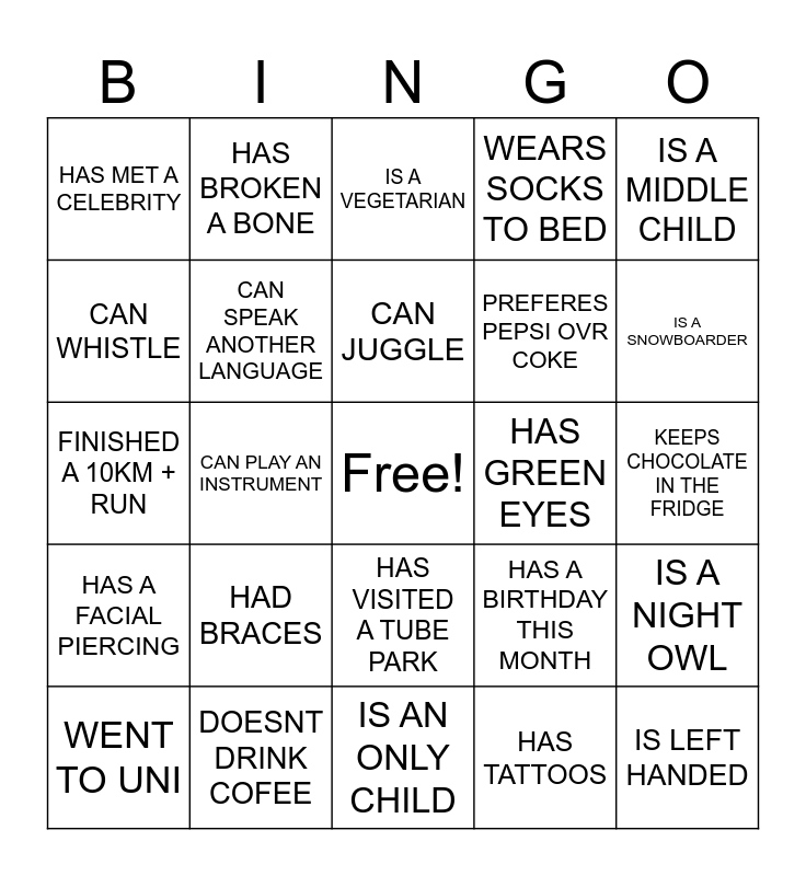 This bingo card has a free space and 24 words: HAD BRACES, DOESNT DRINK COFEE, CAN JUGGLE, WENT TO UNI, IS A MIDDLE CHILD, HAS MET A CELEBRITY, CAN WHISTLE, HAS BROKEN A BONE, HAS GREEN EYES, HAS VISITED A TUBE PARK, PREFERES PEPSI OVR COKE, FINISHED A 10KM + RUN, HAS A BIRTHDAY THIS MONTH, IS A NIGHT OWL, CAN SPEAK ANOTHER LANGUAGE, HAS TATTOOS, KEEPS CHOCOLATE IN THE FRIDGE, IS A VEGETARIAN, IS A SNOWBOARDER, CAN PLAY AN INSTRUMENT, IS LEFT HANDED, HAS A FACIAL PIERCING, WEARS SOCKS TO BED and IS AN ONLY CHILD.