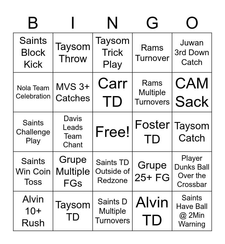 This bingo card has a free space and 39 words: Rizzi gets Excited w/ Team, Hill TD, Saints D Tackle in Backfield, MVS 3+ Catches, Alvin 10+ Rush, Saints TD Outside of Redzone, Carr TD, Saints Geaux for it on 4th Down, Juwan 3rd Down Catch, Saints Win Coin Toss, Davis Leads Team Chant, Rams Turnover, Saints Have Ball @ 2Min Warning, Taysom Catch, Foster TD, Grupe Multiple FGs, Saints Punt Ball Inside 10, Saints Block Kick, Rams Penalty, Grupe 25+ FG, Nola Team Celebration, Saints D Multiple Turnovers, Rams Multiple Turnovers, CAM Sack, Mathieu Talks Trash, Saints Score 2 PTs, Young Sack, Carr Multiple TDs, Lattimore Pick, Taysom Throw, Carr 3+ Completions in a Row, Mike Thomas Flex, Taysom Trick Play, Taysom TD, Alvin TD, Player Throws Ball into Stands, Player Dunks Ball Over the Crossbar, Saints Challenge Play and Nola Return Kick to House.
