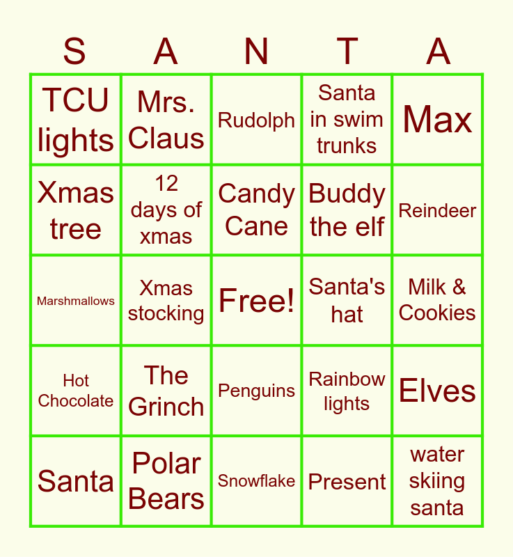 This bingo card has a free space and 24 words: Santa, The Grinch, Candy Cane, Present, Max, TCU lights, Mrs. Claus, Rudolph, Santa's hat, Milk & Cookies, Marshmallows, 12 days of xmas, Rainbow lights, Elves, Xmas tree, Polar Bears, Snowflake, Santa in swim trunks, Reindeer, Hot Chocolate, Xmas stocking, Penguins, Buddy the elf and water skiing santa.