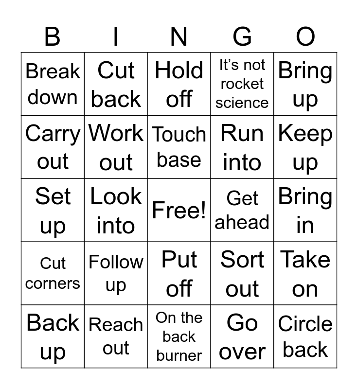This bingo card has a free space and 24 words: Follow up, Reach out, Touch base, Back up, Bring up, Break down, Carry out, Cut back, Get ahead, Put off, Run into, Set up, Sort out, Take on, Work out, Go over, Bring in, Hold off, Keep up, Look into, Circle back, Cut corners, It’s not rocket science and On the back burner.