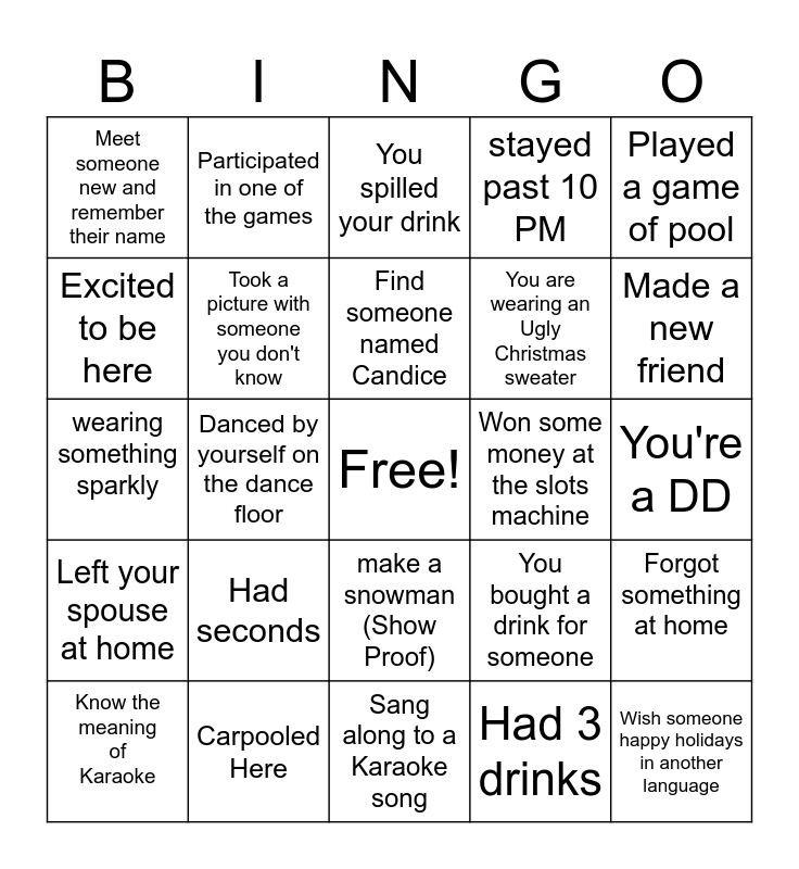 This bingo card has a free space and 24 words: Had seconds, Carpooled Here, Find someone named Candice, Know the meaning of Karaoke, Played a game of pool, Meet someone new and remember their name, Excited to be here, Participated in one of the games, Won some money at the slots machine, make a snowman (Show Proof), You are wearing an Ugly Christmas sweater, wearing something sparkly, You bought a drink for someone, Forgot something at home, Took a picture with someone you don't know, Had 3 drinks, You're a DD, You spilled your drink, Made a new friend, Danced by yourself on the dance floor, Wish someone happy holidays in another language, Left your spouse at home, stayed past 10 PM and Sang along to a Karaoke song.