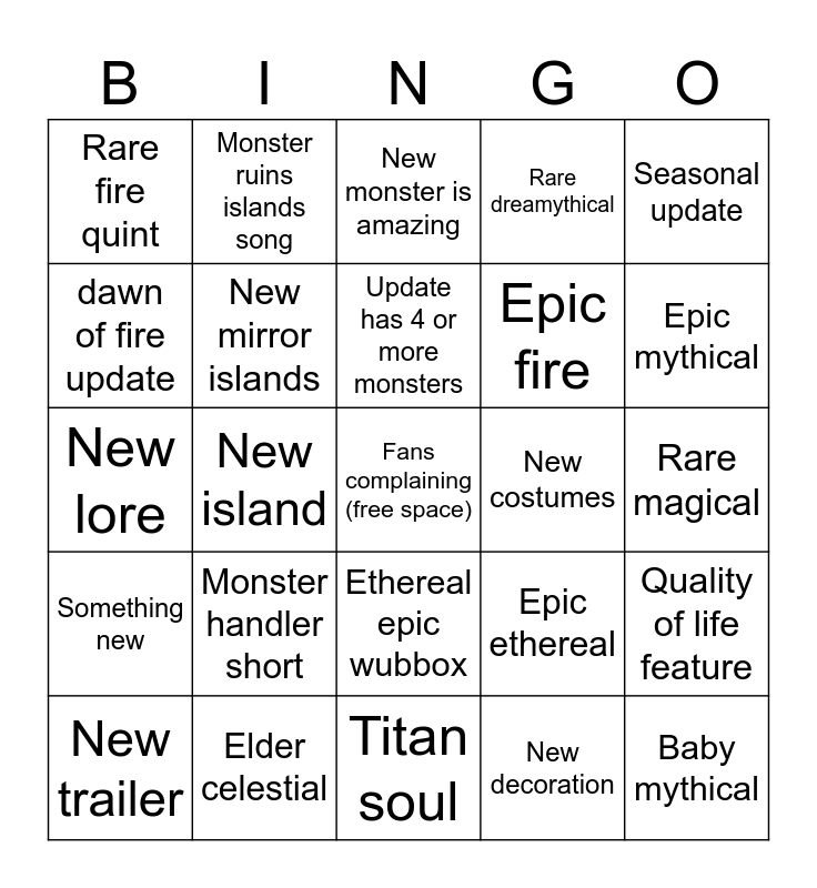 This bingo card has a free space and 24 words: New trailer, Monster handler short, Update has 4 or more monsters, New decoration, Seasonal update, Rare fire quint, Monster ruins islands song, New monster is amazing, New costumes, Rare magical, New lore, New mirror islands, Epic ethereal, Quality of life feature, dawn of fire update, Elder celestial, Titan soul, Rare dreamythical, Epic mythical, Something new, New island, Ethereal epic wubbox, Epic fire and Baby mythical.