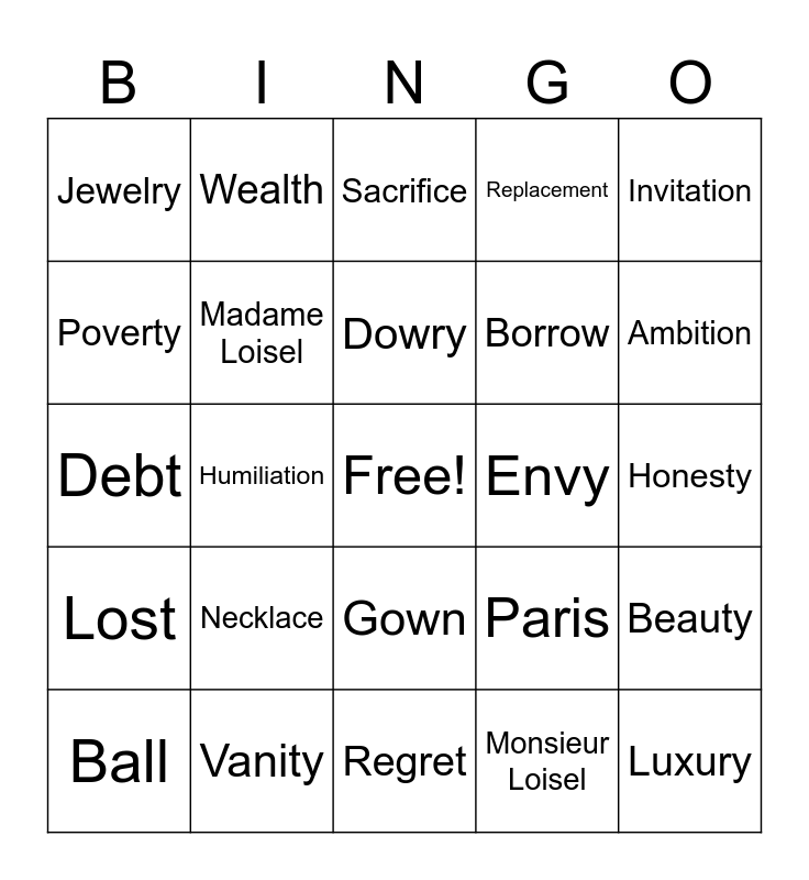 This bingo card has a free space and 24 words: Necklace, Vanity, Dowry, Ball, Invitation, Jewelry, Poverty, Wealth, Envy, Gown, Borrow, Debt, Paris, Beauty, Madame Loisel, Monsieur Loisel, Honesty, Sacrifice, Ambition, Humiliation, Luxury, Lost, Replacement and Regret.