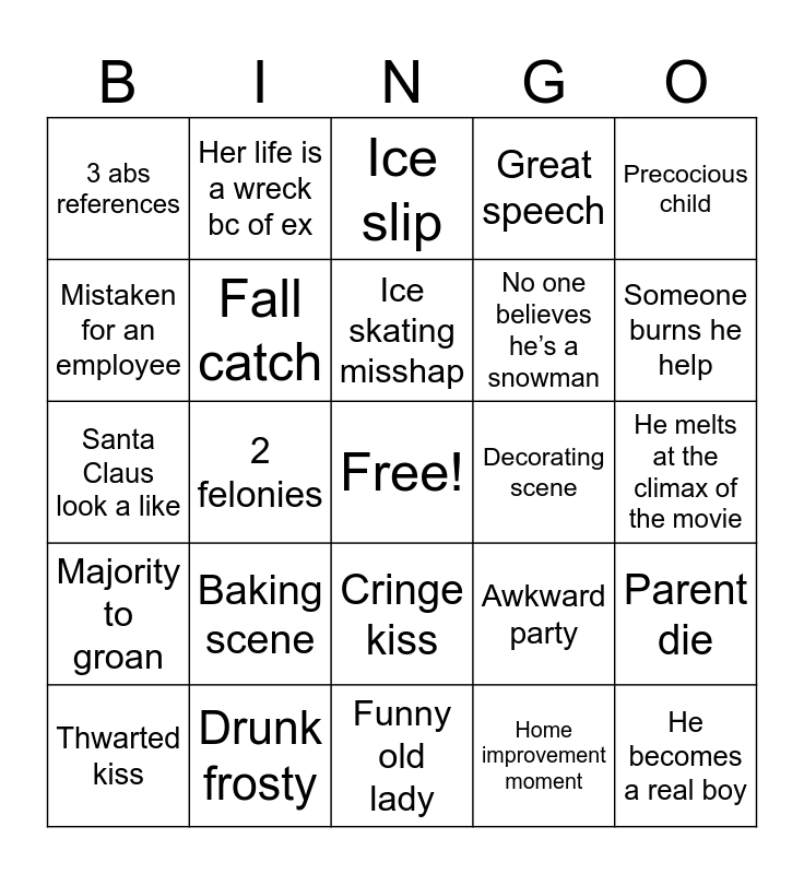 This bingo card has a free space and 29 words: Thwarted kiss, 2 mean girl reference, 2 felonies, No magic explanation, 3 abs references, Ice slip, Fall catch, Baking scene, Decorating scene, Drunk frosty, He melts at the climax of the movie, He becomes a real boy, Funny old lady, Home improvement moment, Someone burns he help, Time bound by christmas, Cringe kiss, Majority to groan, Precocious child, Santa Claus look a like, Awkward party, Someone learns the meaning of Christmas, No one believes he’s a snowman, Mistaken for an employee, Great speech, Her life is a wreck bc of ex, Parent die, Ice skating misshap and Lady is Mrs. Claus.