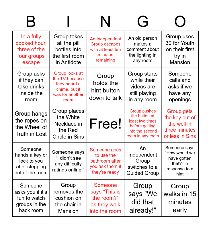 This bingo card has a free space and 30 words: Group removes the cushion on the chair in Mansion, Group knocks 2143 on the actual Knock Chest in Lost, Group places the White Necklace in the Red Circle in Sins, Group asks for a hint before finding the key in the gloves in Antidote, In a fully booked hour, three of the four groups escape, An Independent Group escapes with at least ten minutes remaining, Group looks at the TV because they heard a chime, but it was for another room, Someone goes to use the bathroom after you ask them if they’re ready, Group pushes the button at least two times before getting into the second room in any room, Someone says “This is the room?” as they walk into the room, Group gets the key out of the well in three minutes or less in Sins, Group walks in 15 minutes early, Group says "We did that already!", Group asks for more drinks at least two times, Someone calls and asks if we have any openings, Someone calls and asks what our prices are, An Independent Group switches to a Guided Group, Someone hands a key or lock to you after stepping out of the room, Someone says “I didn’t see any difficulty ratings online.”, Group uses 30 for Youth on their first try in Mansion, Group hangs the ropes on the Wheel of Truth in Lost, Group places the candles on the pentagram in Sins, Group takes all the pill bottles into the first room in Antidote, Group starts while their videos are still playing in any room, Group asks if they can take drinks inside the room, An old person makes a comment about the lighting in any room, Someone says “How would we have gotten that?” in response to a hint, Someone asks you if it’s fun to watch groups in the back room, Group holds the hint button down to talk and A kid puts their mouth directly on the intercom and screams "What?!".
