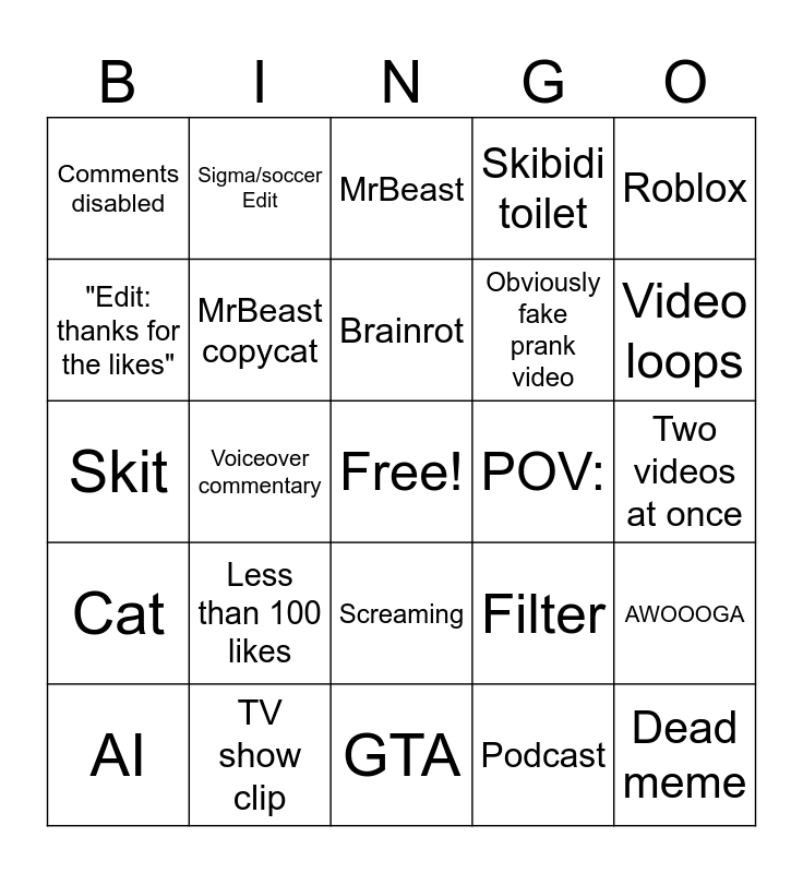 This bingo card has a free space and 24 words: AI, Less than 100 likes, Brainrot, Podcast, Roblox, Comments disabled, Sigma/soccer Edit, MrBeast, POV:, Two videos at once, Skit, MrBeast copycat, Filter, AWOOOGA, "Edit: thanks for the likes", TV show clip, GTA, Skibidi toilet, Video loops, Cat, Voiceover commentary, Screaming, Obviously fake prank video and Dead meme.