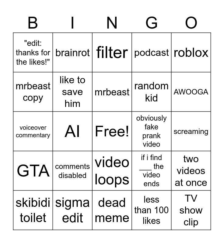 This bingo card has a free space and 24 words: comments disabled, sigma edit, mrbeast, skibidi toilet, roblox, "edit: thanks for the likes!", mrbeast copy, brainrot, obviously fake prank video, video loops, random kid, voiceover commentary, if i find ___ the video ends, two videos at once, like to save him, less than 100 likes, screaming, filter, AWOOGA, AI, TV show clip, GTA, podcast and dead meme.