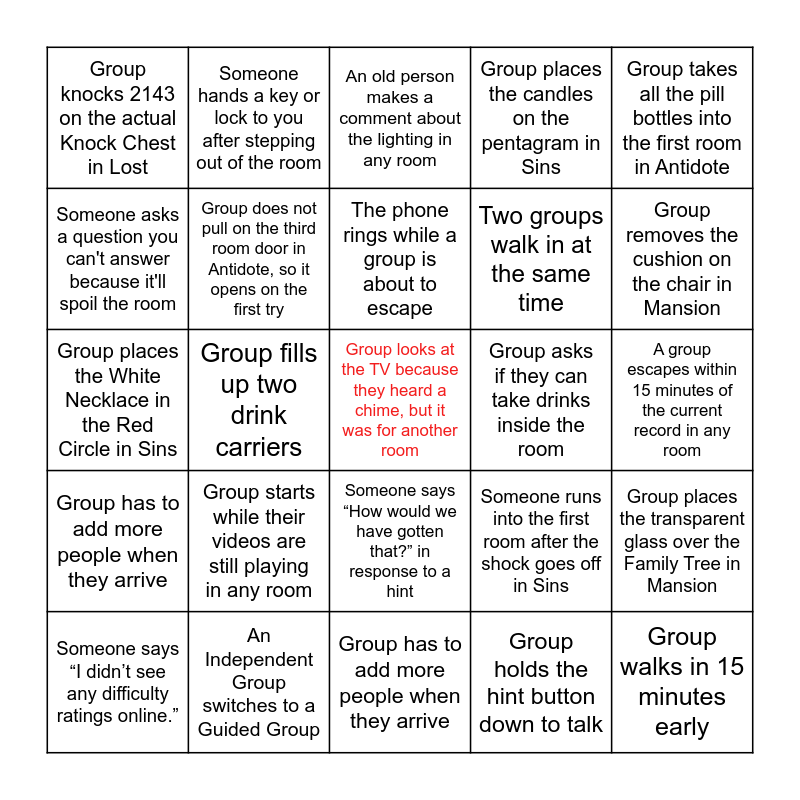 This bingo card has a free space and 44 words: Someone asks you if it’s fun to watch groups in the back room, Group walks in 15 minutes early, Group hangs the ropes on the Wheel of Truth in Lost, Someone says “I didn’t see any difficulty ratings online.”, A kid puts their mouth directly on the intercom and screams "What?!", Group holds the hint button down to talk, An old person makes a comment about the lighting in any room, Group asks for a hint before finding the key in the gloves in Antidote, Group takes all the pill bottles into the first room in Antidote, An Independent Group switches to a Guided Group, Group places the candles on the pentagram in Sins, Group asks if they can take drinks inside the room, Someone says “How would we have gotten that?” in response to a hint, Group starts while their videos are still playing in any room, Group uses 30 for Youth on their first try in Mansion, Group has to add more people when they arrive, Group asks for more drinks at least two times, Group places the White Necklace in the Red Circle in Sins, Someone calls and asks what our prices are, Group removes the cushion on the chair in Mansion, Someone hands a key or lock to you after stepping out of the room, Someone calls and asks if we have any openings, Group says "We did that already!", Group knocks 2143 on the actual Knock Chest in Lost, Group does not hear the chime in any room, A group escapes within 15 minutes of the current record in any room, Group enters a code into the exit door right as their time starts in any room, Group does not find all transparent sheets on their own in Antidote, Someone runs into the first room after the shock goes off in Sins, Group has to add more people when they arrive, Someone makes a comment about the couches in the lobby, Group places the transparent glass over the Family Tree in Mansion, Group shines the flashlight into the Tiki Head, Group presses the hint button twice because they're impatient in any room, Group fills up two drink carriers, An entire group that's at least four people all leave reviews, Two rebookings are made in one day from any staff member, Group turns off the lights in any room, The phone rings while a group is about to escape, Someone asks a question you can't answer because it'll spoil the room, Two groups walk in at the same time, Someone asks how much time they have in the room, Group does not pull on the third room door in Antidote, so it opens on the first try and We have to go in to open the directional lock in Lost.