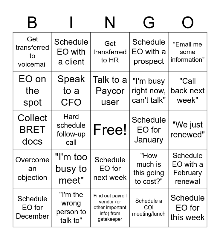 This bingo card has a free space and 29 words: Schedule EO for December, "Call me after the holidays/New Year", Hard schedule follow-up call, "We already have a payroll vendor", Get transferred to voicemail, Get transferred to HR, Speak to a CFO, "I'm too busy to meet", Schedule EO for January, "I'm the wrong person to talk to", "We just renewed", Schedule EO for this week, Find out payroll vendor (or other important info) from gatekeeper, Schedule a COI meeting/lunch, "Call back next week", Leave a voicemail, Schedule EO for next week, Overcome an objection, "Email me some information", Collect BRET docs, "How much is this going to cost?", Speak to a business owner, "I'm busy right now, can't talk", EO on the spot, Schedule EO with a prospect, Schedule EO with a client, Schedule EO with a February renewal, Talk to a Paycor user and Schedule EO with a PEO takeaway.