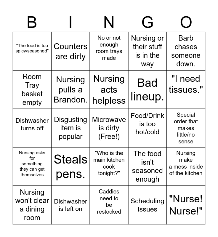This bingo card has a free space and 89 words: "Is __ coming out?" "I don't know", Recycling wasn't taken, "Who is the main kitchen cook tonight?", Nursing wont bring back room trays, "I'm gonna quit/kill myself", Someone doesn't want to do something, Necessary thing not restocked, Low on a lot of items, Staff tries to use regular dishes, Nurses sitting in the lounge instead of working, Copious amounts of fruit in the fridge, Nursing complains about some aspect of the food, Nursing make a mess inside of the kitchen, Special order that makes little/no sense, Items where they aren't supposed to be, Nursing acts helpless, 5+ Special Orders, Trash can(s) haven't been emptied, Resident asks to leave, Overwhelming amount of dirty dishes on dirty carts (4+ plates), Beyond messy tables and/or floors. (Pre-Service), Beyond messy tables and/or floors. (Post-Service), Caddies need to be restocked, "Did something happen this morning?", Dishwasher turns off, Dishwasher is left on, Printing error on the menus., Nursing wont fill out room tray menus, Dishwasher trap has not been cleaned, Nursing asks for special things., Nursing or their stuff is in the way, Disgusting item is popular, Food Item isn't popular (Starter, Dessert, etc.), "The food is too spicy/seasoned", Little/No rags or mop heads left, No or not enough room trays made, Room Tray basket empty, Juice/Coffee trays desperately need to be cleaned., "I need tissues.", Nursing won't clear a dining room, Nursing asks for something they can get themselves, "It's so cold in here.", "It's so hot in here.", Drink machine is/or runs out., The food isn't seasoned enough, Food/Drink is too hot/cold, "We can't do that.", Activities., Multiple undated items, Counters are dirty, Fridge is cluttered, Breaker needs to be reset, Top of dishwasher isn't wiped, Mop bucket has dirty water, Kyle makes a big deal out of something, Callout. (Either shift), Cups put away abnormally., Dirty dishes., Oven is full of saves. (3+), No nursing staff in dining room., Health Concern (Kitchen), Health Concern (Resident), Cook puts food on wrong plate., Runs out of food item., Assist Table not assisted., Jim and Berta act up., Resident grabs., Resident has filthy clothes on., Resident smells really bad., Steals pens., "Nurse! Nurse!", Little fruit in the hydration station., Jess acts up., Bad lineup., Nursing pulls a Brandon., Scheduling Issues, Resident takes too long to leave., Bottom of garbage can is dirty., Something breaks., Resident's family acts up., Barb chases someone down., Kyle leaves early/doesn't come in., People come out late, 7+ Roomtrays (One side), Utensils/dishes aren't put away., Silverware can be folded., Spills item., Drops silverware. and Dessert looks weird..