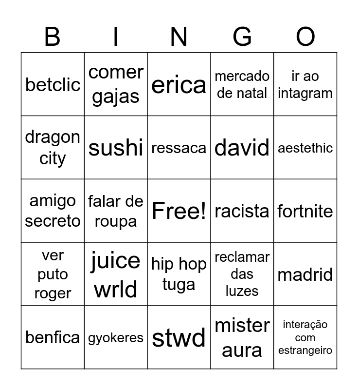 This bingo card has a free space and 24 words: juice wrld, gyokeres, ressaca, benfica, ir ao intagram, betclic, dragon city, comer gajas, racista, hip hop tuga, david, amigo secreto, reclamar das luzes, madrid, sushi, mister aura, fortnite, erica, aestethic, falar de roupa, interação com estrangeiro, ver puto roger, mercado de natal and stwd.