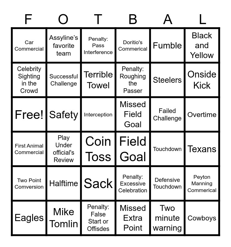 This bingo card has 36 words: Penalty: Excessive Celebration, Sack, Missed Extra Point, Celebrity Sighting in the Crowd, First Animal Commercial, Missed Field Goal, Successful Challenge, Penalty: False Start or Offisdes, Fumble, Defensive Touchdown, Onside Kick, Doritio's Commerical, Peyton Manning Commerical, Safety, Penalty: Roughing the Passer, Car Commercial, Two Point Comversion, Failed Challenge, Free!, Penalty: Pass Interference, Interception, Play Under official's Review, Field Goal, Coin Toss, Touchdown, Assyline’s favorite team, Steelers, Mike Tomlin, Terrible Towel, Black and Yellow, Cowboys, Eagles, Texans, Overtime, Halftime and Two minute warning.