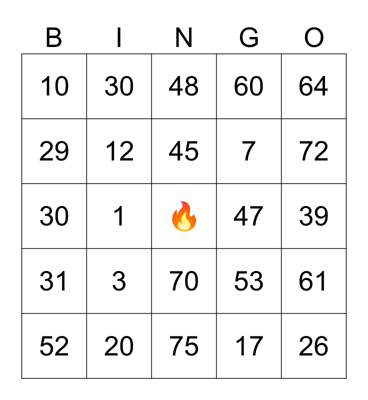 This bingo card has a free space and 24 words: 3, 20, 45, 52, 64, 10, 29, 30, 47, 70, 7, 30, 53, 61, 12, 17, 39, 48, 72, 1, 26, 31, 60 and 75.