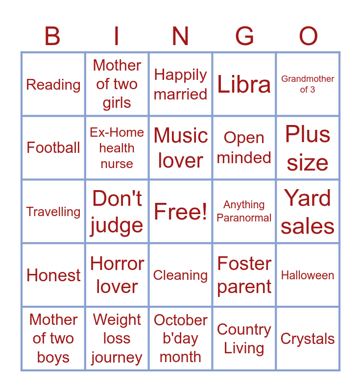 This bingo card has a free space and 24 words: Mother of two boys, Horror lover, Music lover, Country Living, Grandmother of 3, Reading, Mother of two girls, Happily married, Anything Paranormal, Yard sales, Travelling, Ex-Home health nurse, Foster parent, Halloween, Football, Weight loss journey, October b'day month, Libra, Plus size, Honest, Don't judge, Cleaning, Open minded and Crystals.