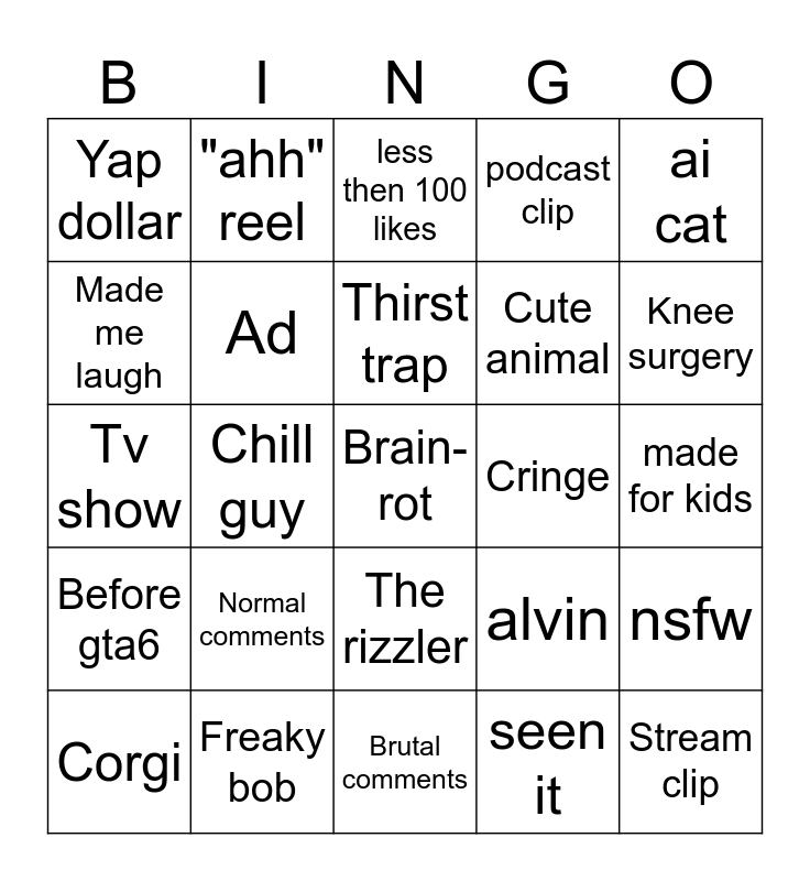 This bingo card has a free space and 24 words: Normal comments, Freaky bob, Thirst trap, Corgi, ai cat, Yap dollar, Made me laugh, "ahh" reel, Cringe, The rizzler, Cute animal, Tv show, alvin, nsfw, Ad, seen it, made for kids, less then 100 likes, Knee surgery, Chill guy, Stream clip, Before gta6, podcast clip and Brutal comments.