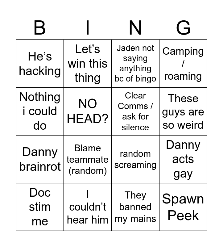 This bingo card has 16 words: I couldn’t hear him, Danny acts gay, Jaden not saying anything bc of bingo, He’s hacking, Danny brainrot, Let’s win this thing, random screaming, They banned my mains, Nothing i could do, NO HEAD?, Doc stim me, Camping / roaming, Blame teammate (random), These guys are so weird, Clear Comms / ask for silence and Spawn Peek.