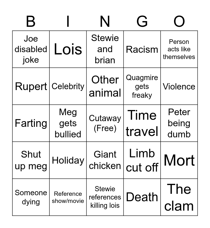 This bingo card has a free space and 24 words: Holiday, Reference show/movie, Other animal, Someone dying, Person acts like themselves, Joe disabled joke, Rupert, Lois, Time travel, Giant chicken, Quagmire gets freaky, Farting, Limb cut off, Mort, Celebrity, Death, Peter being dumb, Stewie and brian, Violence, Meg gets bullied, The clam, Shut up meg, Racism and Stewie references killing lois.