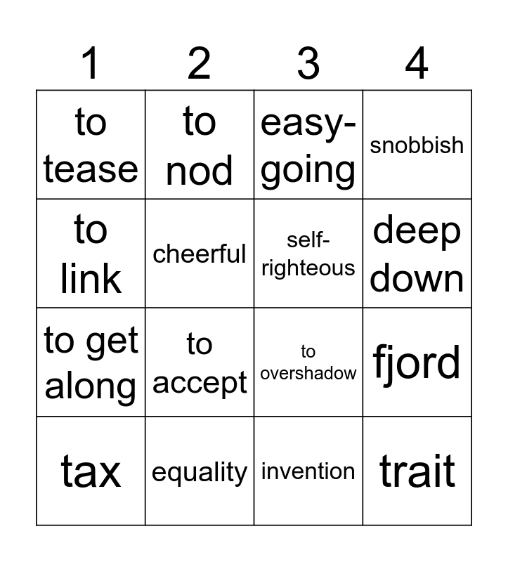 This bingo card has 16 words: equality, fjord, easy-going, to tease, to get along, to nod, to overshadow, invention, to link, cheerful, tax, snobbish, to accept, deep down, self-righteous and trait.