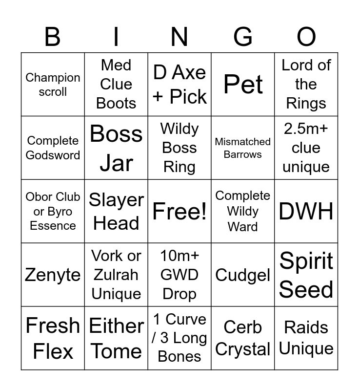 This bingo card has a free space and 24 words: Vork or Zulrah Unique, Either Tome, Wildy Boss Ring, Fresh Flex, Lord of the Rings, Champion scroll, Complete Godsword, Med Clue Boots, Complete Wildy Ward, 10m+ GWD Drop, Mismatched Barrows, Obor Club or Byro Essence, Cudgel, Spirit Seed, Boss Jar, Cerb Crystal, DWH, D Axe + Pick, 2.5m+ clue unique, Slayer Head, Raids Unique, Zenyte, Pet and 1 Curve / 3 Long Bones.